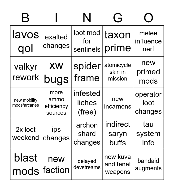 This bingo card has a free space and 24 words: ips changes, new faction, spider frame, blast mods, melee influence nerf, lavos qol, valkyr rework, exalted changes, new incarnons, archon shard changes, atomicycle skin in mission, new mobility mods/arcanes, indirect saryn buffs, tau system info, xw bugs, new kuva and tenet weapons, operator loot changes, loot mod for sentinels, new primed mods, more ammo efficiency sources, bandaid augments, 2x loot weekend, taxon prime and delayed devstreams.