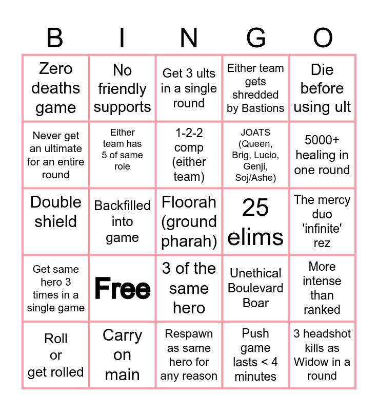 This bingo card has 25 words: Free, Respawn as same hero for any reason, 1-2-2 comp (either team), Roll or get rolled, Die before using ult, Zero deaths game, Never get an ultimate for an entire round, No friendly supports, 25 elims, 3 of the same hero, JOATS (Queen, Brig, Lucio, Genji, Soj/Ashe), Double shield, Unethical Boulevard Boar, More intense than ranked, Either team has 5 of same role, 3 headshot kills as Widow in a round, The mercy duo 'infinite' rez, Get 3 ults in a single round, 5000+ healing in one round, Backfilled into game, Floorah (ground pharah), Carry on main, Get same hero 3 times in a single game, Either team gets shredded by Bastions and Push game lasts < 4 minutes.