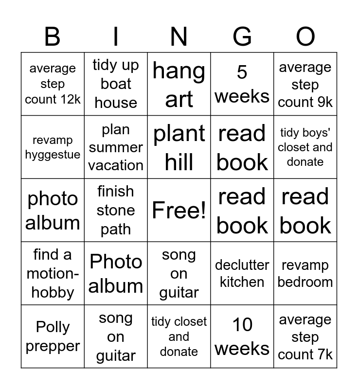 This bingo card has a free space and 24 words: Photo album, song on guitar, plant hill, Polly prepper, average step count 9k, average step count 12k, revamp hyggestue, tidy up boat house, read book, song on guitar, read book, photo album, declutter kitchen, revamp bedroom, plan summer vacation, 10 weeks, read book, hang art, tidy boys' closet and donate, finish stone path, average step count 7k, find a motion-hobby, 5 weeks and tidy closet and donate.