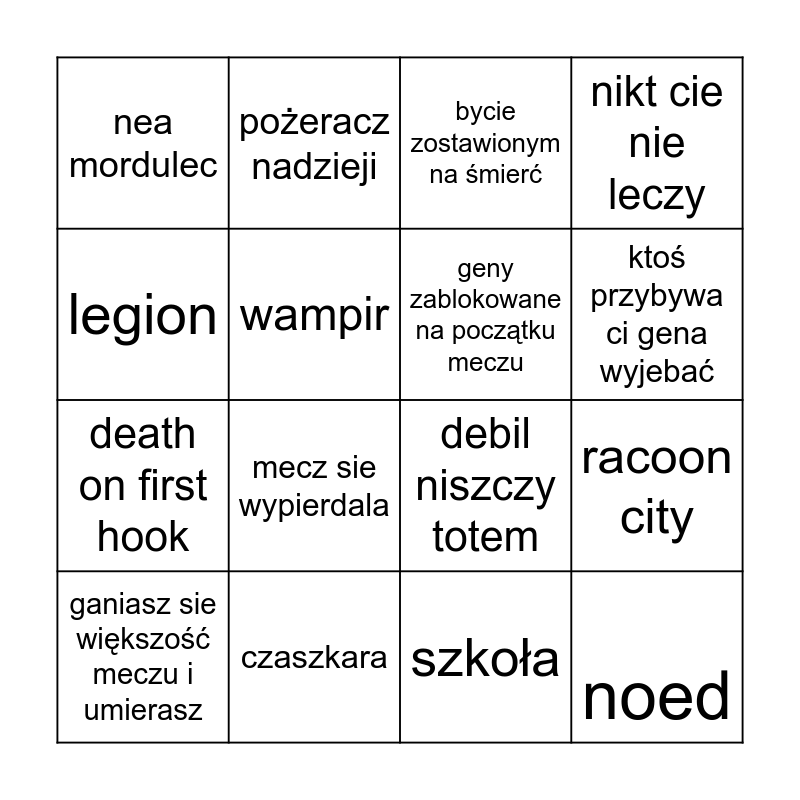 This bingo card has 16 words: czaszkara, racoon city, bycie zostawionym na śmierć, nea mordulec, death on first hook, pożeracz nadzieji, debil niszczy totem, szkoła, legion, wampir, ganiasz sie większość meczu i umierasz, nikt cie nie leczy, mecz sie wypierdala, ktoś przybywa ci gena wyjebać, geny zablokowane na początku meczu and noed.