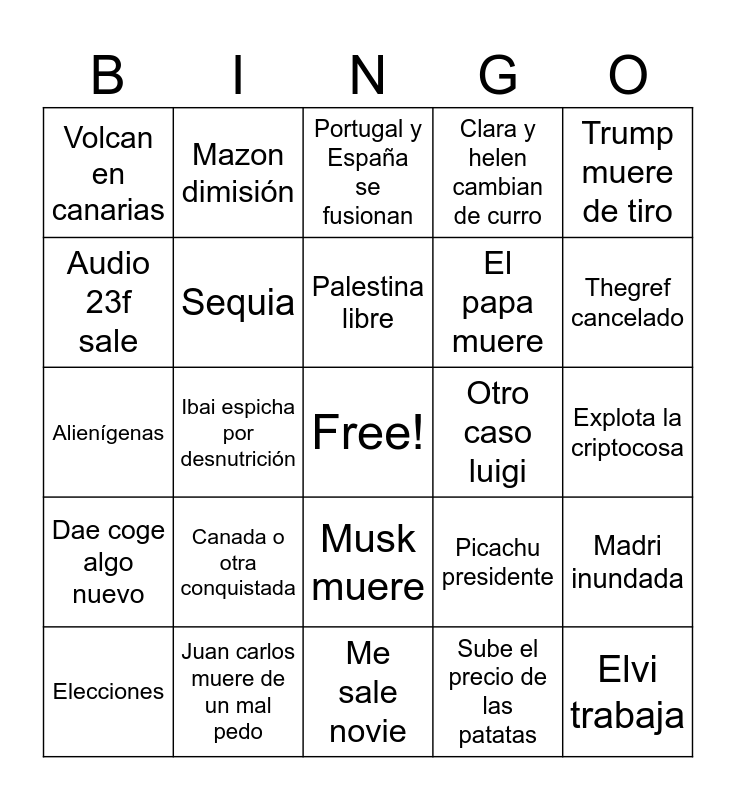 This bingo card has a free space and 24 words: Canada o otra conquistada, Juan carlos muere de un mal pedo, Palestina libre, Elecciones, Trump muere de tiro, Volcan en canarias, Audio 23f sale, Mazon dimisión, Otro caso luigi, Musk muere, El papa muere, Alienígenas, Picachu presidente, Madri inundada, Sequia, Sube el precio de las patatas, Explota la criptocosa, Portugal y España se fusionan, Thegref cancelado, Ibai espicha por desnutrición, Elvi trabaja, Dae coge algo nuevo, Clara y helen cambian de curro and Me sale novie.