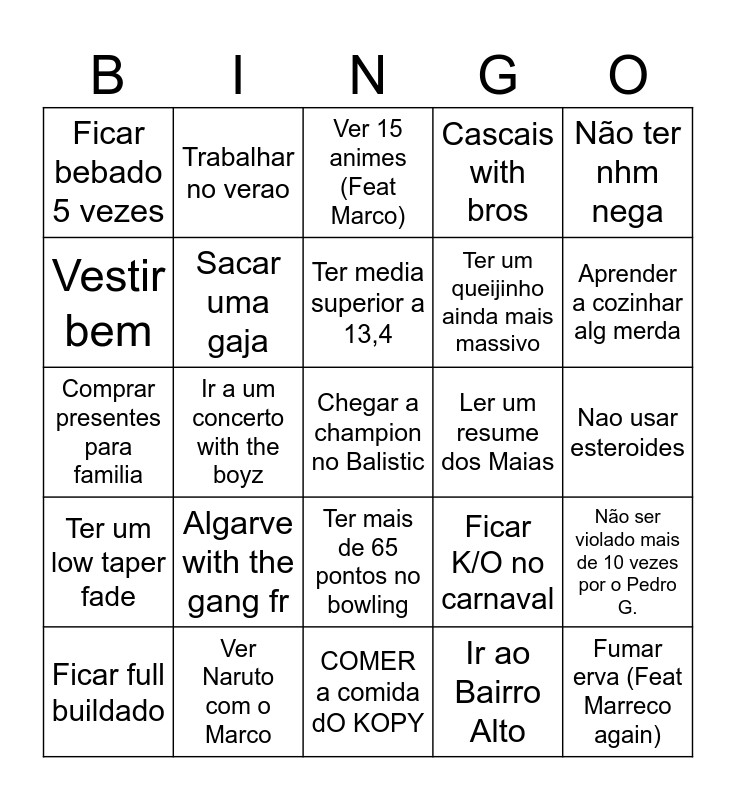 This bingo card has 25 words: Ter um low taper fade, Ver Naruto com o Marco, Chegar a champion no Balistic, Ir ao Bairro Alto, Não ter nhm nega, Ficar bebado 5 vezes, Trabalhar no verao, Ver 15 animes (Feat Marco), Ler um resume dos Maias, Não ser violado mais de 10 vezes por o Pedro G., Vestir bem, Sacar uma gaja, COMER a comida dO KOPY, Ficar K/O no carnaval, Aprender a cozinhar alg merda, Ficar full buildado, Ir a um concerto with the boyz, Ter media superior a 13,4, Ter um queijinho ainda mais massivo, Nao usar esteroides, Comprar presentes para familia, Algarve with the gang fr, Ter mais de 65 pontos no bowling, Cascais with bros and Fumar erva (Feat Marreco again).