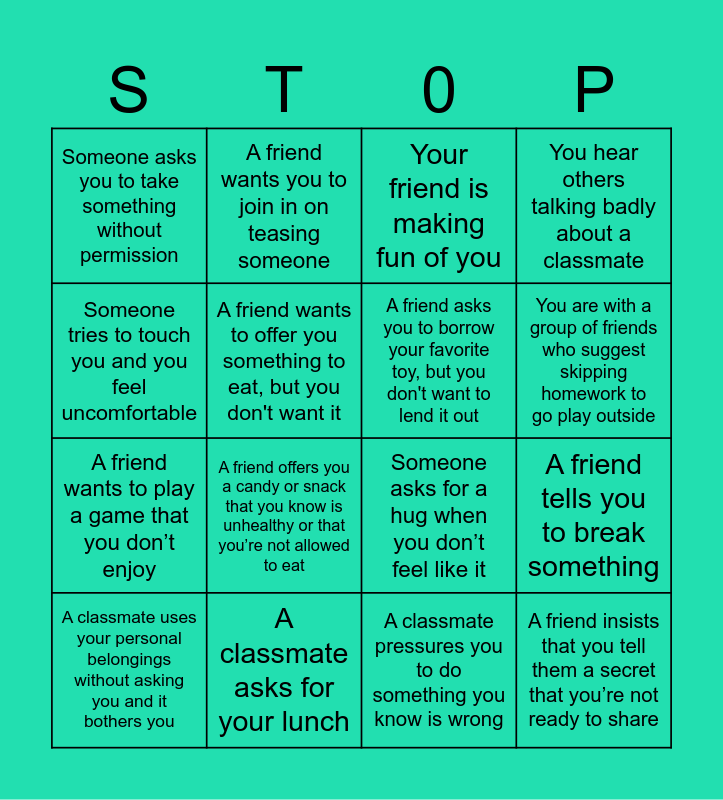 This bingo card has 16 words: A classmate asks for your lunch, A friend tells you to break something, Your friend is making fun of you, Someone asks you to take something without permission, A friend wants to play a game that you don’t enjoy, A friend wants you to join in on teasing someone, Someone asks for a hug when you don’t feel like it, A classmate pressures you to do something you know is wrong, Someone tries to touch you and you feel uncomfortable, A friend wants to offer you something to eat, but you don't want it, A classmate uses your personal belongings without asking you and it bothers you, You hear others talking badly about a classmate, A friend offers you a candy or snack that you know is unhealthy or that you’re not allowed to eat, You are with a group of friends who suggest skipping homework to go play outside, A friend asks you to borrow your favorite toy, but you don't want to lend it out and A friend insists that you tell them a secret that you’re not ready to share.