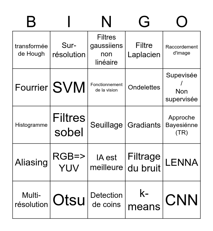This bingo card has a free space and 24 words: RGB=> YUV, Otsu, Fonctionnement de la vision, Multi-résolution, Raccordement d'image, transformée de Hough, Fourrier, Sur-résolution, Gradiants, IA est meilleure, Ondelettes, Histogramme, Filtrage du bruit, LENNA, SVM, k-means, Approche Bayesiénne (TR), Filtres gaussiiens non linéaire, Supevisée / Non supervisée, Filtres sobel, CNN, Aliasing, Filtre Laplacien and Detection de coins.