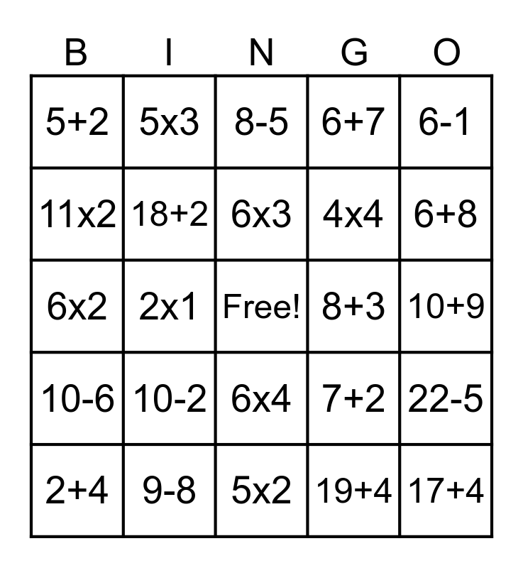 This bingo card has a free space and 24 words: 2+4, 10-2, 6x3, 19+4, 6-1, 5+2, 5x3, 8-5, 8+3, 10+9, 6x2, 18+2, 7+2, 22-5, 11x2, 9-8, 5x2, 6+7, 6+8, 10-6, 2x1, 6x4, 4x4 and 17+4.