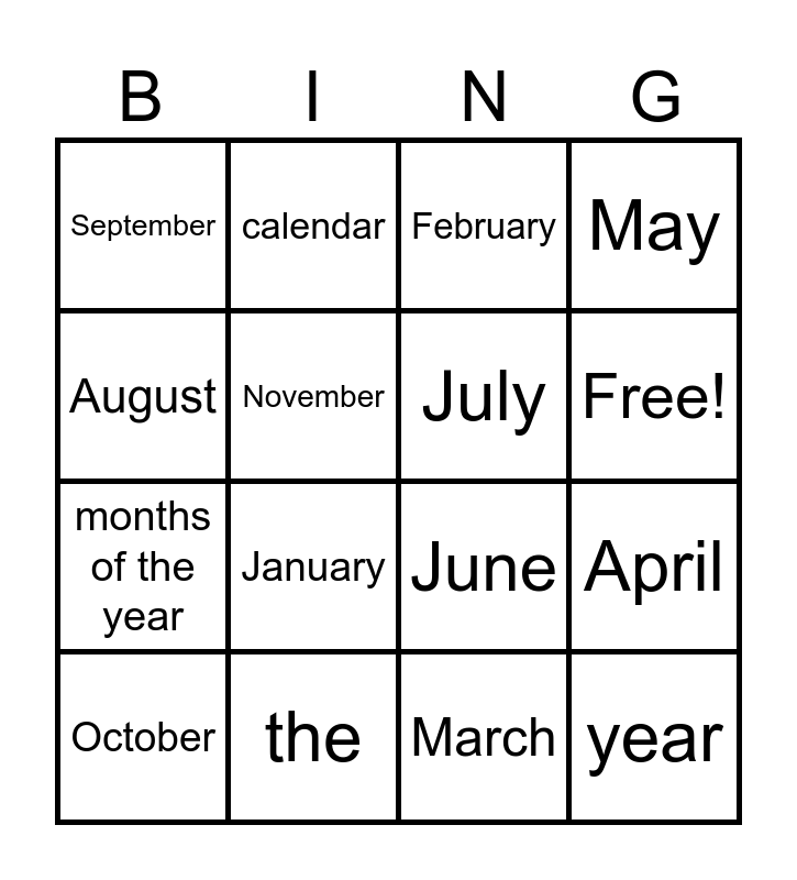 This bingo card has 18 words: January, year, February, September, June, May, October, calendar, Free!, months of the year, March, August, April, November, July, December, the and calendar.