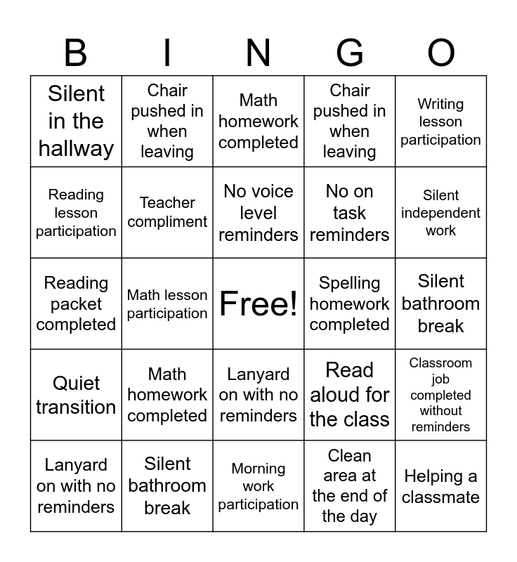 This bingo card has a free space and 24 words: Math homework completed, Silent bathroom break, No voice level reminders, Lanyard on with no reminders, Writing lesson participation, Silent in the hallway, Reading lesson participation, Chair pushed in when leaving, Spelling homework completed, Lanyard on with no reminders, No on task reminders, Reading packet completed, Read aloud for the class, Classroom job completed without reminders, Teacher compliment, Clean area at the end of the day, Silent bathroom break, Math homework completed, Silent independent work, Math lesson participation, Helping a classmate, Quiet transition, Chair pushed in when leaving and Morning work participation.