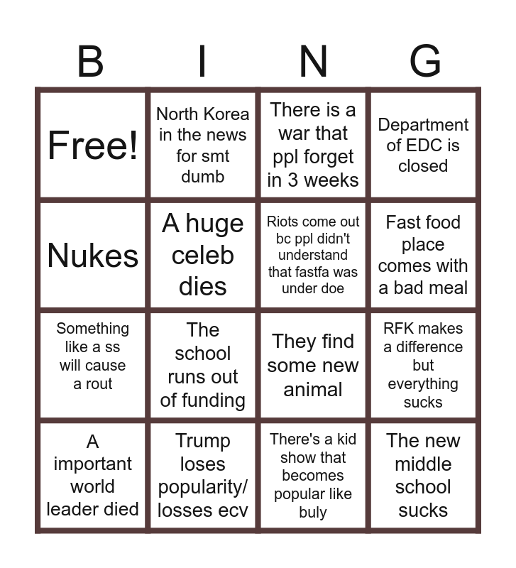 This bingo card has 16 words: A important world leader died, Trump loses popularity/ losses ecv, There is a war that ppl forget in 3 weeks, Department of EDC is closed, Nukes, North Korea in the news for smt dumb, They find some new animal, RFK makes a difference but everything sucks, Free!, A huge celeb dies, There's a kid show that becomes popular like buly, Fast food place comes with a bad meal, Something like a ss will cause a rout, The school runs out of funding, Riots come out bc ppl didn't understand that fastfa was under doe and The new middle school sucks.