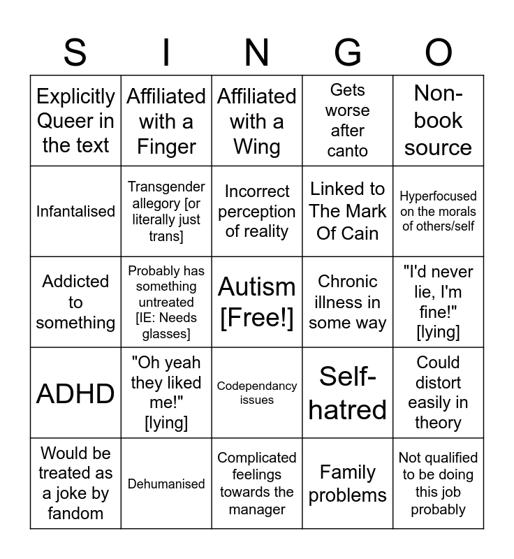 This bingo card has a free space and 24 words: "Oh yeah they liked me!" [lying], Dehumanised, Incorrect perception of reality, Would be treated as a joke by fandom, Non-book source, Explicitly Queer in the text, Infantalised, Affiliated with a Finger, Chronic illness in some way, Codependancy issues, Linked to The Mark Of Cain, Addicted to something, Self-hatred, Could distort easily in theory, Transgender allegory [or literally just trans], Family problems, "I'd never lie, I'm fine!" [lying], Affiliated with a Wing, Hyperfocused on the morals of others/self, Probably has something untreated [IE: Needs glasses], Not qualified to be doing this job probably, ADHD, Gets worse after canto and Complicated feelings towards the manager.