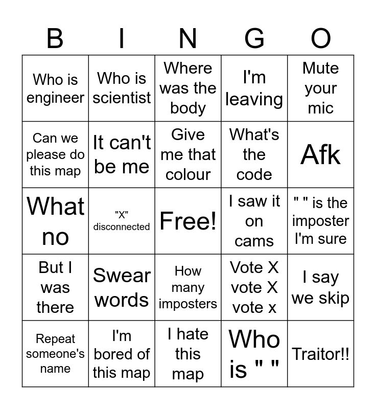 This bingo card has a free space and 24 words: Repeat someone's name, Swear words, Give me that colour, Who is " ", Mute your mic, Who is engineer, Who is scientist, Where was the body, I saw it on cams, " " is the imposter I'm sure, What no, It can't be me, Vote X vote X vote x, I say we skip, Can we please do this map, I'm bored of this map, I hate this map, I'm leaving, Afk, But I was there, "X" disconnected, How many imposters, What's the code and Traitor!!.