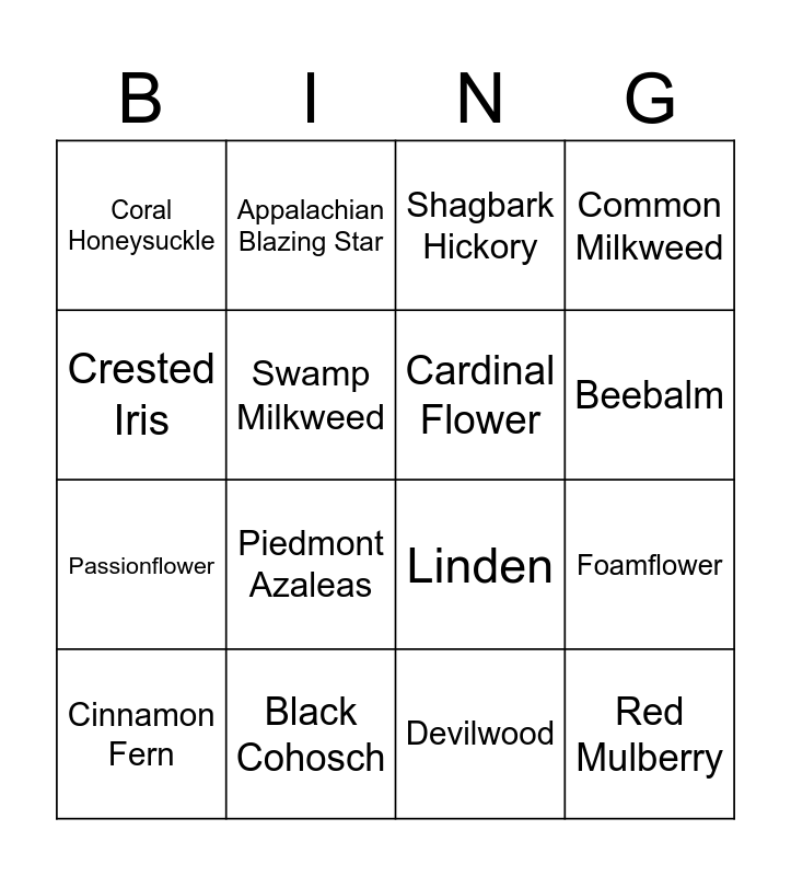 This bingo card has 49 words: NATIVE, Cinnamon Fern, Royal Fern, Sensitive Fern, Inland Sea Oats, Carolina Phlox, Appalachian Blazing Star, Mountain Mint, Swamp Milkweed, Butterflyweed, Cardinal Flower, Common Milkweed, Coreopsis, Black Eyed Susan, Wild Geranium, Wild Indigo, Beebalm, Black Cohosch, Columbine, Crested Iris, Foamflower, Carolina Jessamine, Coral Honeysuckle, Passionflower, Atamasco Lily, Piedmont Azaleas, Silky Camellia, American Beautyberry, Wild Hydrangea, Red Mulberry, Service Berry, Walters Viburnum, Wild Rhododendron, Dogwood, Pawpaw, Persimmon, Redbud, Sweet Bay Magnolia, Devilwood, Wild Cherry, Fringe Tree, Blackgum Tree, Tulip Poplar, Sweetgum, Linden, Shagbark Hickory, Eastern Hemlock, Eastern Red Cedar and Southern Magnolia.