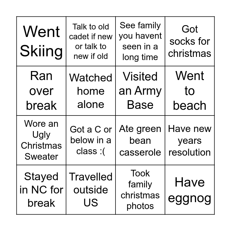 This bingo card has 16 words: Travelled outside US, Have new years resolution, See family you havent seen in a long time, Went Skiing, Wore an Ugly Christmas Sweater, Talk to old cadet if new or talk to new if old, Ate green bean casserole, Took family christmas photos, Ran over break, Watched home alone, Stayed in NC for break, Got socks for christmas, Got a C or below in a class :(, Went to beach, Visited an Army Base and Have eggnog.