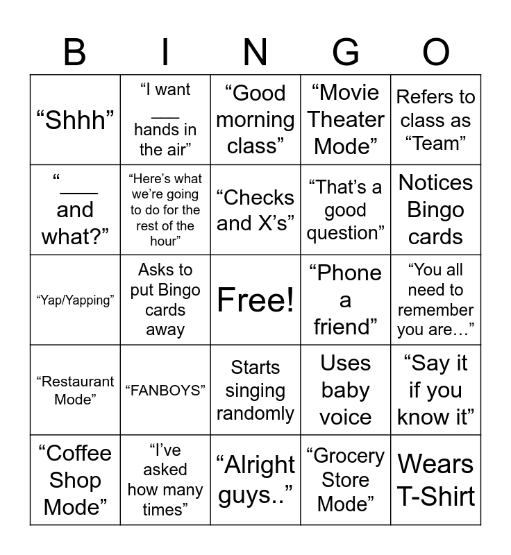 This bingo card has a free space and 25 words: “FANBOYS”, “Alright guys..”, “Checks and X’s”, “Coffee Shop Mode”, Refers to class as “Team”, “Shhh”, “___ and what?”, “I want ___ hands in the air”, “Phone a friend”, Starts singing randomly, “That’s a good question”, “Yap/Yapping”, Uses baby voice, “Say it if you know it”, “Here’s what we’re going to do for the rest of the hour”, “INS”, “You all need to remember you are…”, “Good morning class”, Notices Bingo cards, Asks to put Bingo cards away, Wears T-Shirt, “I’ve asked how many times”, “Restaurant Mode”, “Movie Theater Mode” and “Grocery Store Mode”.