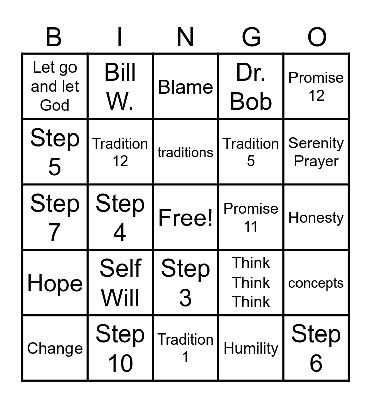 This bingo card has a free space and 29 words: Change, Promise 3, Step 4, Trust, Let go and let God, Blame, Tradition 12, Self Will, Promise 11, Step 10, Honesty, Step 6, Tradition 1, Humility, Serenity Prayer, Tradition 4, Step 3, Hope, Promise 12, Step 7, Think Think Think, Serenity, Tradition 5, Step 5, Dr. Bob, Bill W., concepts, traditions and warranties.