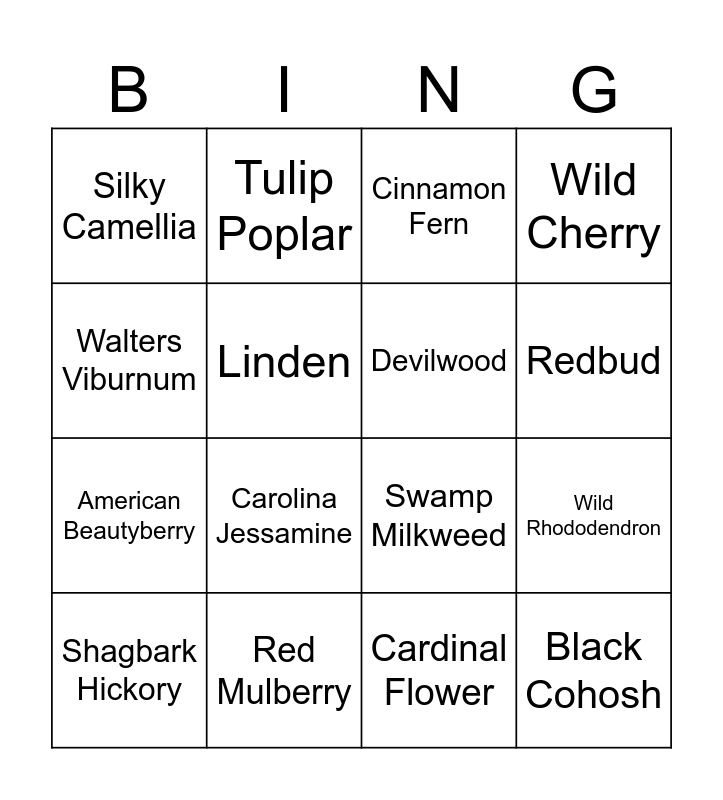 This bingo card has 49 words: Free!, Shagbark Hickory, Eastern Hemlock, Eastern Red Cedar, Southern Magnolia, Blackgum Tree, Tulip Poplar, Sweetgum, Linden, Sweet Bay Magnolia, Devilwood, Wild Cherry, Fringe Tree, Dogwood, Pawpaw, Persimmon, Redbud, Red Mulberry, Service Berry, Walters Viburnum, Wild Rhododendron, Piedmont Azaleas, Silky Camellia, American Beautyberry, Wild Hydrangea, Carolina Jessamine, Coral Honeysuckle, Passionflower, Atamasco Lily, Black Cohosh, Columbine, Crested Iris, Foamflower, Black Eyed Susan, Wild Geranium, Wild Indigo, Beebalm, Butterflyweed, Cardinal Flower, Common Milkweed, Coreopsis, Carolina Phlox, Appalachian Blazing Star, Mountain Mint, Swamp Milkweed, Cinnamon Fern, Royal Fern, Sensitive Fern and Inland Sea Oats.