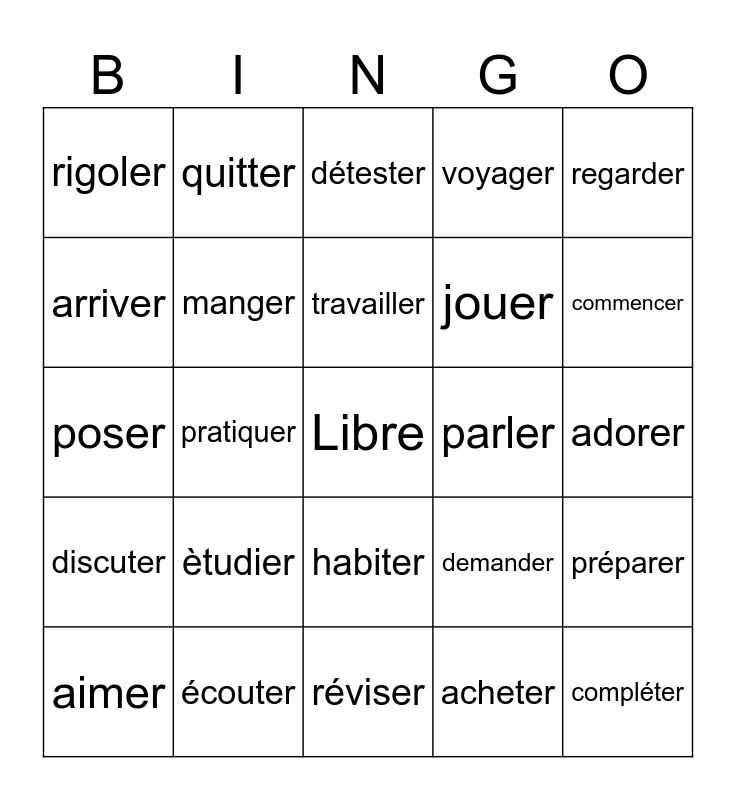 This bingo card has a free space and 24 words: ètudier, écouter, travailler, aimer, regarder, rigoler, arriver, quitter, parler, habiter, jouer, poser, demander, préparer, manger, acheter, adorer, détester, commencer, pratiquer, compléter, discuter, voyager and réviser.
