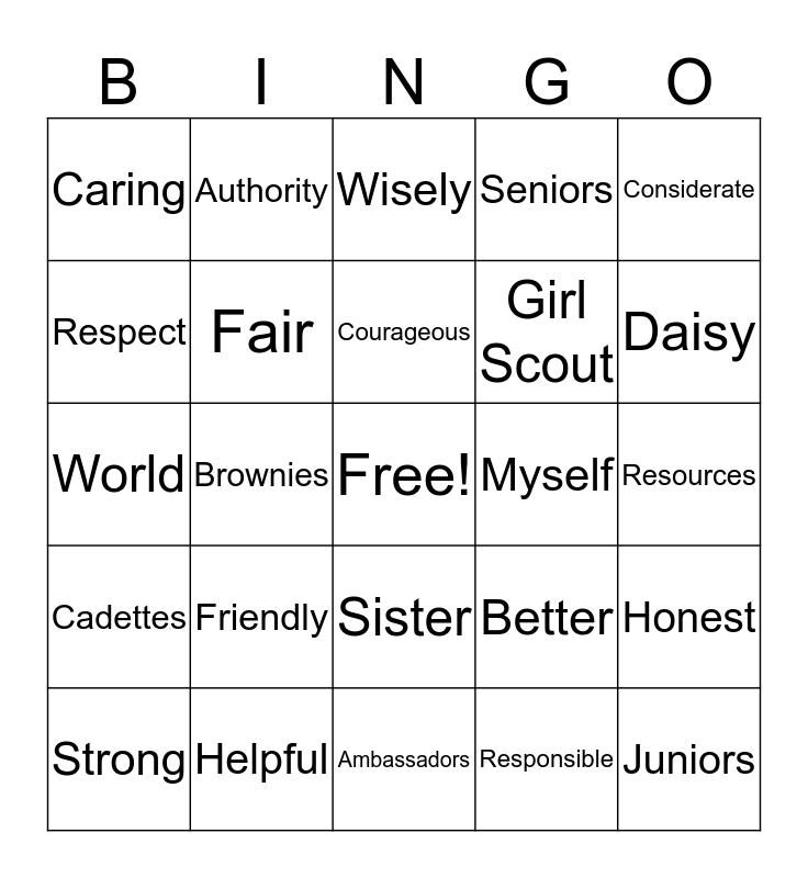 This bingo card has a free space and 24 words: Friendly, Helpful, Courageous, Strong, Considerate, Caring, Respect, Authority, Myself, Sister, Girl Scout, World, Better, Honest, Fair, Responsible, Resources, Wisely, Daisy, Brownies, Juniors, Cadettes, Seniors and Ambassadors.