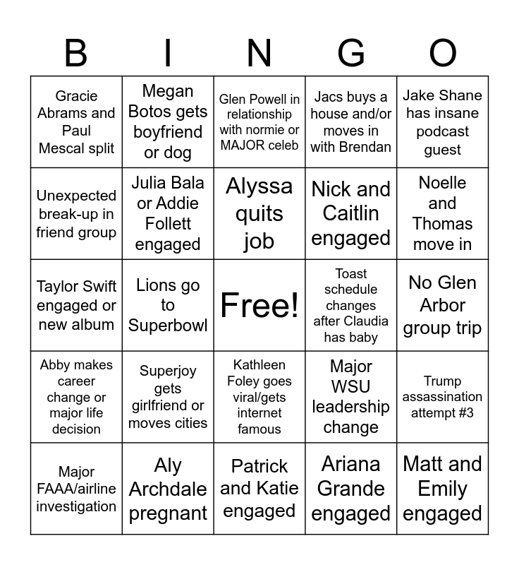 This bingo card has a free space and 24 words: Superjoy gets girlfriend or moves cities, Aly Archdale pregnant, Alyssa quits job, Major FAAA/airline investigation, Jake Shane has insane podcast guest, Gracie Abrams and Paul Mescal split, Unexpected break-up in friend group, Megan Botos gets boyfriend or dog, Toast schedule changes after Claudia has baby, Kathleen Foley goes viral/gets internet famous, Nick and Caitlin engaged, Taylor Swift engaged or new album, Major WSU leadership change, Trump assassination attempt #3, Julia Bala or Addie Follett engaged, Ariana Grande engaged, No Glen Arbor group trip, Glen Powell in relationship with normie or MAJOR celeb, Noelle and Thomas move in, Lions go to Superbowl, Matt and Emily engaged, Abby makes career change or major life decision, Jacs buys a house and/or moves in with Brendan and Patrick and Katie engaged.