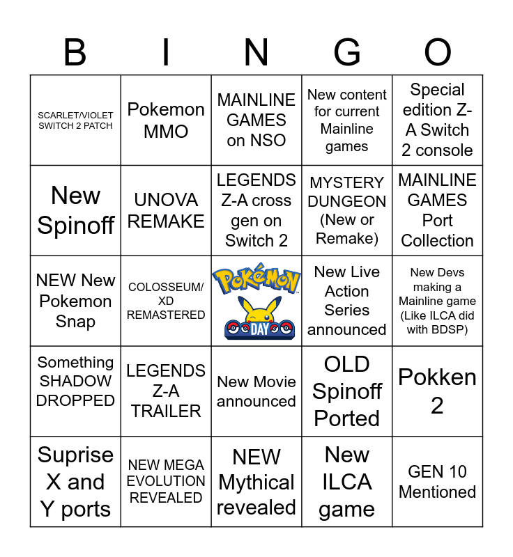 This bingo card has a free space and 24 words: LEGENDS Z-A TRAILER, NEW MEGA EVOLUTION REVEALED, LEGENDS Z-A cross gen on Switch 2, Suprise X and Y ports, Special edition Z-A Switch 2 console, SCARLET/VIOLET SWITCH 2 PATCH, New Spinoff, Pokemon MMO, New Live Action Series announced, New Movie announced, MYSTERY DUNGEON (New or Remake), NEW New Pokemon Snap, OLD Spinoff Ported, Pokken 2, UNOVA REMAKE, New ILCA game, New Devs making a Mainline game (Like ILCA did with BDSP), MAINLINE GAMES on NSO, MAINLINE GAMES Port Collection, COLOSSEUM/ XD REMASTERED, GEN 10 Mentioned, Something SHADOW DROPPED, New content for current Mainline games and NEW Mythical revealed.