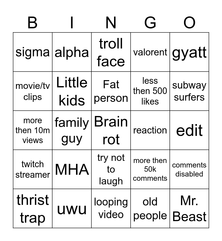 This bingo card has a free space and 24 words: MHA, uwu, Fat person, thrist trap, gyatt, sigma, movie/tv clips, alpha, reaction, try not to laugh, less then 500 likes, more then 10m views, more then 50k comments, comments disabled, Little kids, old people, edit, troll face, subway surfers, family guy, Mr. Beast, twitch streamer, valorent and looping video.