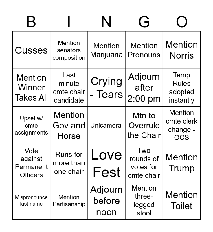 This bingo card has a free space and 41 words: Office Space Fight, Upset w/ cmte assignments, Mtn Adjourn Sine Die, Last minute cmte chair candidate, Mention Partisanship, Love Fest, Crying - Tears, Mention Ernie Chambers, Mention Norris, Vote against Permanent Officers, Mention Gov and Horse, Mention Pronouns, Mention Toilet, Mention cmte clerk change - OCS, Mtn to Overrule the Chair, Runs for more than one chair, Baby/kid in sen's chair, Cusses, Mention NE Constitution, Mention Marijuana, Mention Trump, Mention Israel/Palestine, Adjourn before noon, Adjourn after 2:00 pm, Stand at ease for over an hour, Mention Affordable Housing, Mention three-legged stool, Temp Rules debate over 1 hr, Temp Rules adopted instantly, Recess for lunch, Mention Gun Control, Mention senators composition, Mispronounce last name, Mtn for Cloture, Two rounds of votes for cmte chair, Mention Winner Takes All, Mention ex-senator(s), Runs for all cmte chairs, I should have been on Appros, Mention new grandbaby and Mention Property Tax.