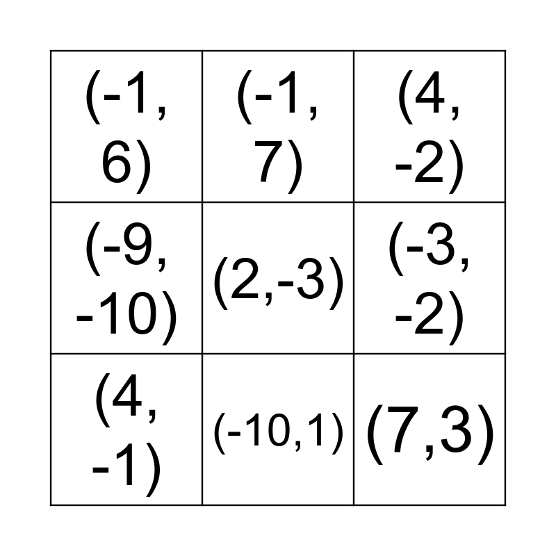 This bingo card has 12 words: (-7, 2), (7,3), (2,-3), (-3, -2), (-1, 7), (4, -2), (-10,1), (-2, -4), (-1, 6), (-9, -10), (4, -1) and (-7, 2).