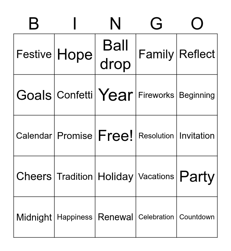This bingo card has a free space and 24 words: Tradition, Happiness, Year, Midnight, Reflect, Festive, Goals, Hope, Resolution, Holiday, Fireworks, Calendar, Vacations, Party, Confetti, Celebration, Invitation, Ball drop, Beginning, Promise, Countdown, Cheers, Family and Renewal.