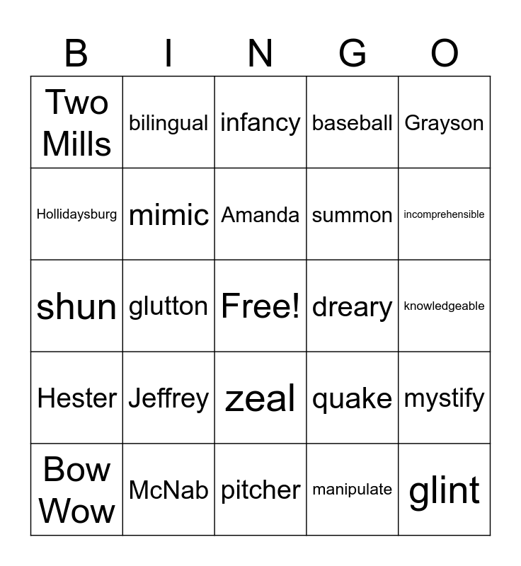 This bingo card has a free space and 24 words: Jeffrey, McNab, Amanda, Bow Wow, Grayson, Two Mills, Hollidaysburg, bilingual, dreary, zeal, summon, shun, quake, mystify, mimic, manipulate, knowledgeable, infancy, incomprehensible, glutton, glint, Hester, baseball and pitcher.
