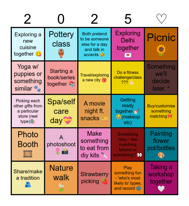 This bingo card has 25 words: Photo Booth π, Nature walk π, A movie night ft. snacks π«, Play something fun - 'who's most likely to' types, and record π, Picnic π», Exploring a new cuisine together π, Pottery class πΊ, Both pretend to be someone else for a day and talk in accents π€£, Getting ready together π π»π(makeup etc), Painting flower pot/bottles π¨, Yoga w/ puppies or something similar πΎ, Starting a book/series together π, Strawberry picking π, Something risky - like matching tattoos or something? π, Something we'll decide later. *, Share/make a tradition π«, Spa/self care dayπ, Travel/exploring a new city π, Do a fitness challenge/class ??? πͺπ», Buy/customise something matchingπ, Picking each other gifts from a particular store (reel type)π, A photoshoot π·πΈ, Make something to eat from diy kits πͺ, Exploring Delhi together π and Taking a workshop together π€.