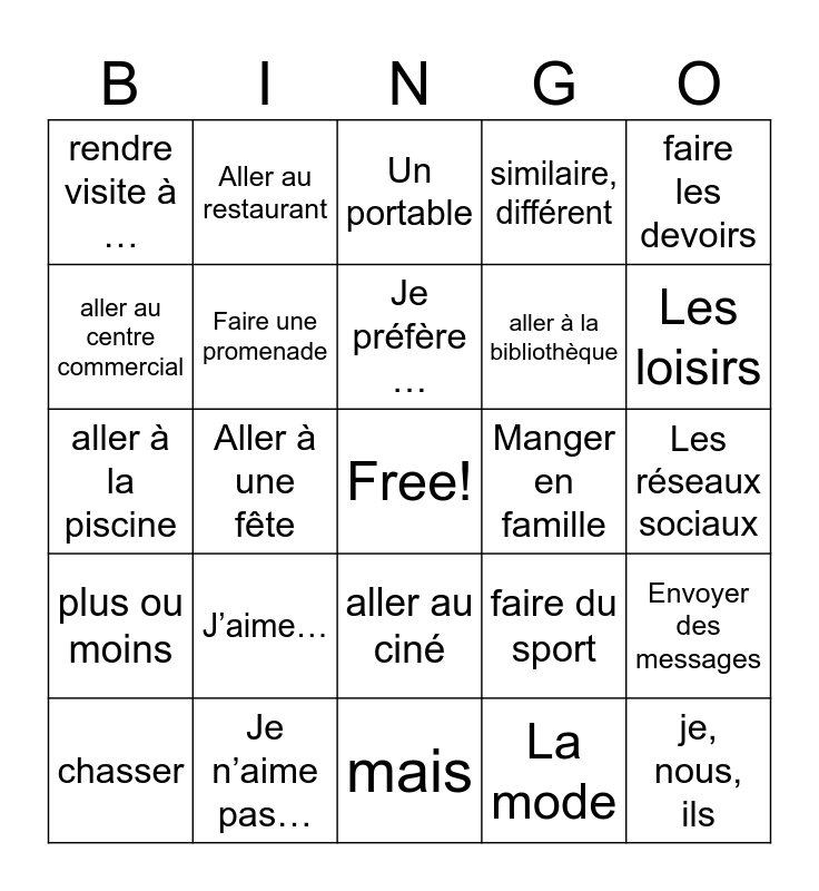 This bingo card has a free space and 24 words: J’aime…, Je n’aime pas…, Je préfère …, chasser, faire les devoirs, rendre visite à …, aller au centre commercial, Aller au restaurant, Manger en famille, aller au ciné, aller à la bibliothèque, aller à la piscine, faire du sport, Envoyer des messages, Faire une promenade, La mode, Les réseaux sociaux, Un portable, Les loisirs, Aller à une fête, je, nous, ils, plus ou moins, similaire, différent and mais.