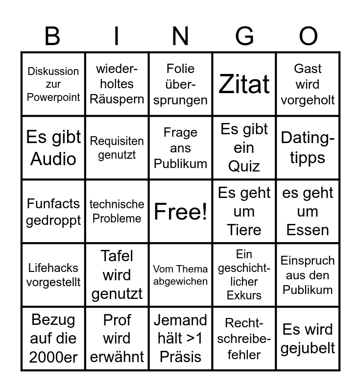This bingo card has a free space and 24 words: Tafel wird genutzt, Prof wird erwähnt, Frage ans Publikum, Bezug auf die 2000er, Gast wird vorgeholt, Diskussion zur Powerpoint, Es gibt Audio, wieder- holtes Räuspern, Es geht um Tiere, Vom Thema abgewichen, Es gibt ein Quiz, Funfacts gedroppt, Ein geschicht- licher Exkurs, Einspruch aus den Publikum, Requisiten genutzt, Recht- schreibe- fehler, es geht um Essen, Folie über-sprungen, Dating- tipps, technische Probleme, Es wird gejubelt, Lifehacks vorgestellt, Zitat and Jemand hält >1 Präsis.