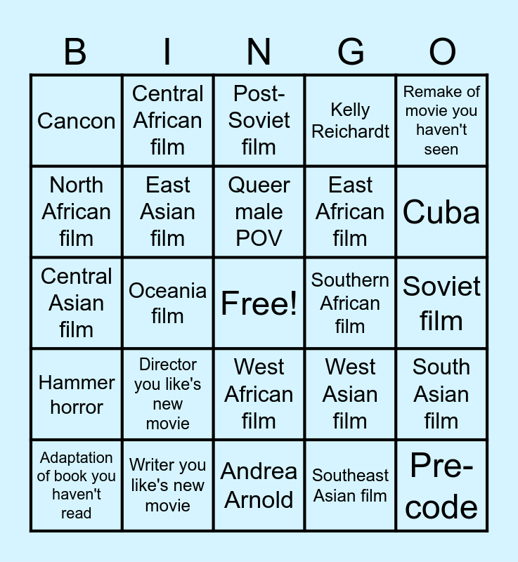 This bingo card has a free space and 24 words: Director you like's new movie, Writer you like's new movie, Queer male POV, Adaptation of book you haven't read, Remake of movie you haven't seen, Cancon, North African film, Central African film, Southern African film, West African film, East African film, Central Asian film, West Asian film, South Asian film, East Asian film, Southeast Asian film, Soviet film, Post-Soviet film, Cuba, Oceania film, Pre-code, Hammer horror, Kelly Reichardt and Andrea Arnold.