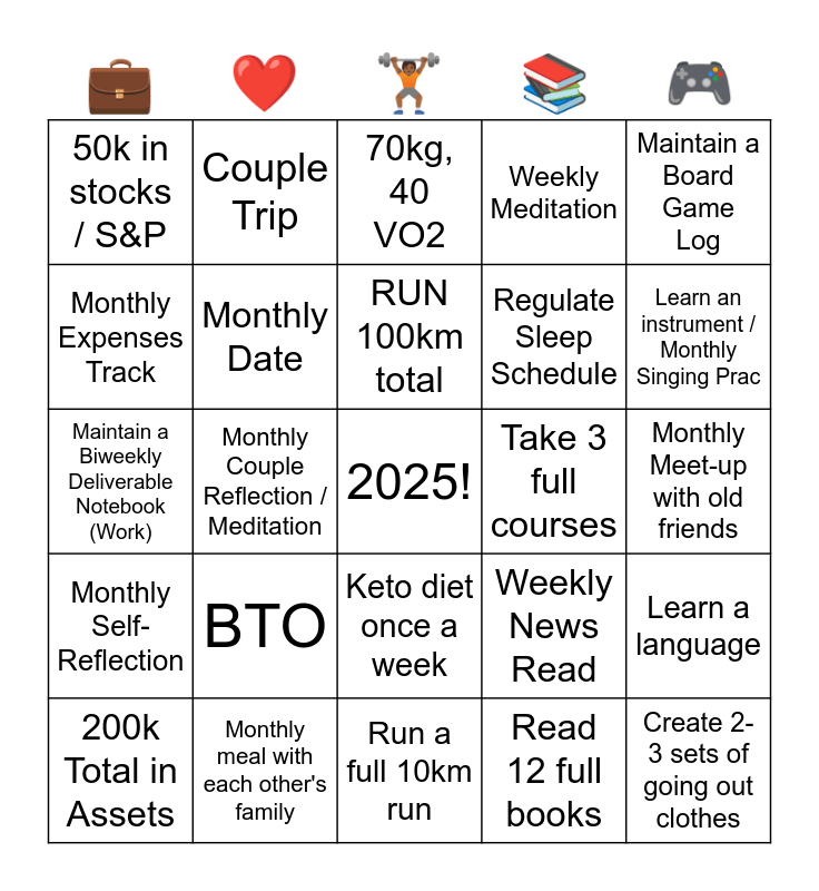 This bingo card has a free space and 24 words: 200k Total in Assets, BTO, RUN 100km total, Read 12 full books, Maintain a Board Game Log, 50k in stocks / S&P, Couple Trip, 70kg, 40 VO2, Take 3 full courses, Monthly Meet-up with old friends, Maintain a Biweekly Deliverable Notebook (Work), Monthly Date, Weekly News Read, Learn a language, Monthly Expenses Track, Monthly meal with each other's family, Run a full 10km run, Weekly Meditation, Learn an instrument / Monthly Singing Prac, Monthly Self-Reflection, Monthly Couple Reflection / Meditation, Keto diet once a week, Regulate Sleep Schedule and Create 2-3 sets of going out clothes.