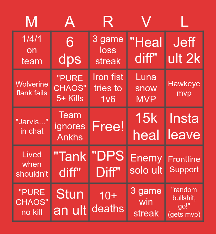 This bingo card has 1 images, a free space and 44 words: 3 C&D in a row, "random bullshit, go!" (gets mvp), 3 dps insta-lock, "PURE CHAOS" no kill, spawn door portal, 3 game win streak, 3 game loss streak, 4k bomb, Jeff ult 2k, Stun an ult, "Heal diff", 15k heal, "DPS Diff", "Tank diff", 0 death, 10+ deaths, "AGAIN" 3x, "Jarvis..." in chat, C9, Hawkeye mvp, 6 dps, "zoning" ult, 2/2/2 on team, 1/4/1 on team, Team wipe, Insta leave, AFK, Res'ed, Enemy solo ult, Lived when shouldn't, Died when shouldn't, Frontline Support, Meme name, Team ignores spider nest, Team ignores Ankhs, Scarlet witch/ Magneto team up, Freaky moment in chat, Melee kill w/ non Melee hero, Iron fist tries to 1v6, Wolverine flank fails, Luna snow MVP, "GG EZ", "PURE CHAOS" 5+ Kills and "___ Diff" we won??.