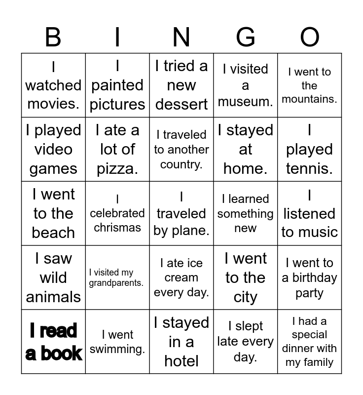 This bingo card has a free space and 24 words: I visited my grandparents., I went swimming., I traveled to another country., I read a book, I went to the mountains., I watched movies., I played video games, I painted pictures, I learned something new, I ate ice cream every day., I stayed at home., I went to the beach, I went to the city, I went to a birthday party, I ate a lot of pizza., I slept late every day., I listened to music, I tried a new dessert, I played tennis., I celebrated chrismas, I had a special dinner with my family, I saw wild animals, I visited a museum. and I stayed in a hotel.