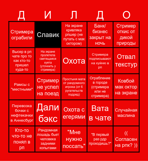 This bingo card has 70 words: ПОЕЗД, Ковбой мак октор на экране, Змея, Яблочко скидывает наездника, Рандомная лошадь бьет человека задними копытами, Происходит ограбеживание, Банк/бизнес закрыт на ночь, Стример лежит на пузе (может и на спине), Стример откис от дикой природы, Стример откис от предмета интерьера, Случайная маслина, Убийство кабана, Стримера ограбили, На экране кривляка рпшер (не путать с мак октором), На экране рейнджеры 5 полка (армейцы-фриказоиды), Стример не успел на поезд, Охота с егерями, Стримера подписывают на хуйню в рп, Поставили на деньги оказанием "нужной" услуги (мед/ерп/оружейника), Перевозка бочки с нефтекачки в Аннесбург, Ограбление в городе (стримера или не стримера), Вата в чате, Отвал текстур, Краш, Рестарт сервера через x, Рамсы с рыжим, Стали свидетелями драки, Стали свидетелями перестрелки, "В первый раз рдр проходишь?", Покупка еды и ее поедание, Славик, Кто-то заболел/заразился, Приглашение в законники, Встреча с представителем власти (мэр/ губернатор/ министр постных дел и тд), Падение в грязь лицом, Ванная, Посещение лагеря, "Ты панк или эмо? / Южанин или северянин", Запретка, Высер в рп чате про то как кто-то пришел куда-то, (( Согласен на рпк? )), Дали бэкс, Простыня мата от рандомного игрока (от 6 ругательств подряд), "x? А что это такое", Дорожно- конное- происшествие (таран коня, телеги, дилижанса), На экране пролетела светящаяся хуета (уточнить у стримера), Кто-то что-то не понял в рп, Стример спутал игрока с нпц / Стример спутал нпц с игроком, Посещение штата АМБАРИНО, Посещение штата НЬЮ-ГАННОВЕР, Посещение штата ВЕСТ-ЭЛИЗАБЕТ, Посещение штата ЛЕМОЙН, Посещение штата НЬЮ-ОСТИН, Женщина в штанах на экране, "Мне нужно поссать", Стример откис от гравитации, Охота, Рп посиделки, На экране фарм ресурсов, Потеря шляпы, Рамсы с "местными", Рамсы, Westvision rdr 2 song competition, "Да-да мы это умеем делать" (нет, не умеют), Последняя жалоба, Тяпнули настоечки, Необходимость в рп логопеде (отсутствуют буквы русского алфавита в речи), нпс жмуры, Заплывы по воде and Пафосные цитаты.