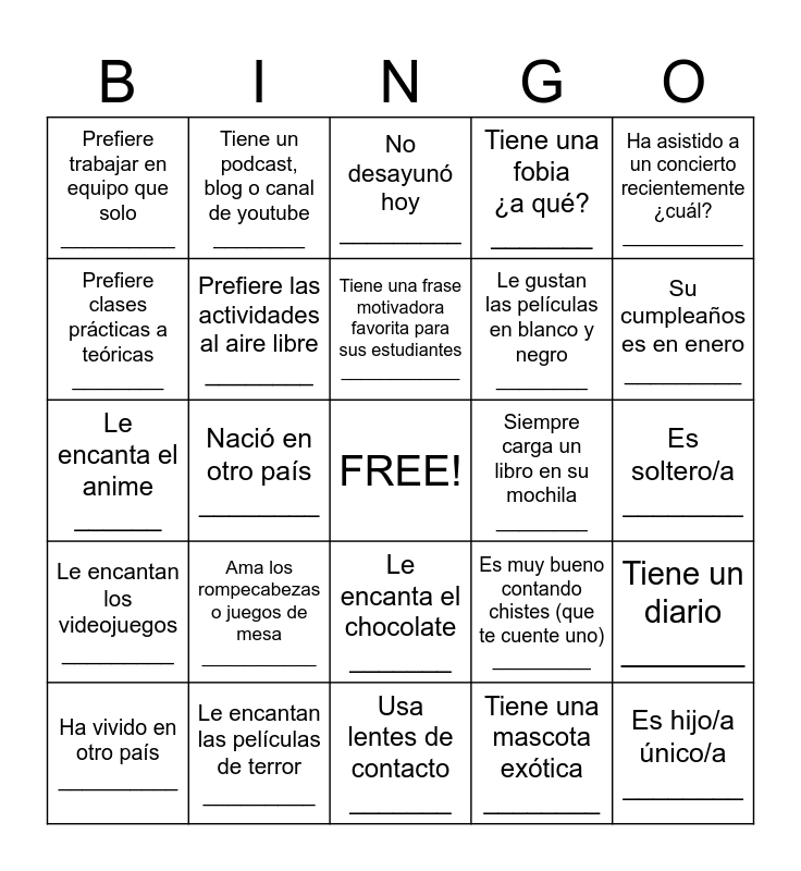 This bingo card has a free space and 24 words: Ama los rompecabezas o juegos de mesa ___________, Le encantan las películas de terror _________, Tiene una frase motivadora favorita para sus estudiantes ____________, Ha vivido en otro país __________, Ha asistido a un concierto recientemente ¿cuál?___________, Prefiere trabajar en equipo que solo __________, Prefiere clases prácticas a teóricas ________, Tiene un podcast, blog o canal de youtube ________, Siempre carga un libro en su mochila ________, Le encanta el chocolate _______, Le gustan las películas en blanco y negro ________, Le encanta el anime ______, Es muy bueno contando chistes (que te cuente uno) _________, Tiene un diario _______, Prefiere las actividades al aire libre ________, Tiene una mascota exótica ________, Es soltero/a ________, No desayunó hoy _________, Su cumpleaños es en enero _________, Nació en otro país ________, Es hijo/a único/a ________, Le encantan los videojuegos _________, Tiene una fobia ¿a qué?_______ and Usa lentes de contacto _______.