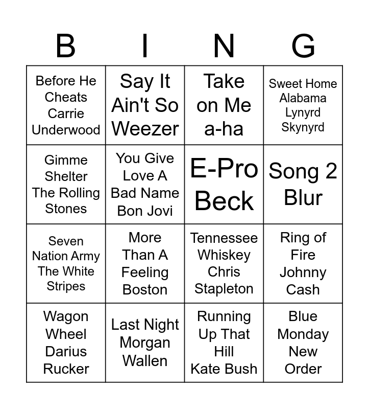 This bingo card has 16 words: Last Night Morgan Wallen, Ring of Fire Johnny Cash, Take on Me a-ha, Before He Cheats Carrie Underwood, Seven Nation Army The White Stripes, Say It Ain't So Weezer, Tennessee Whiskey Chris Stapleton, Running Up That Hill Kate Bush, Gimme Shelter The Rolling Stones, You Give Love A Bad Name Bon Jovi, Wagon Wheel Darius Rucker, Sweet Home Alabama Lynyrd Skynyrd, More Than A Feeling Boston, Song 2 Blur, E-Pro Beck and Blue Monday New Order.