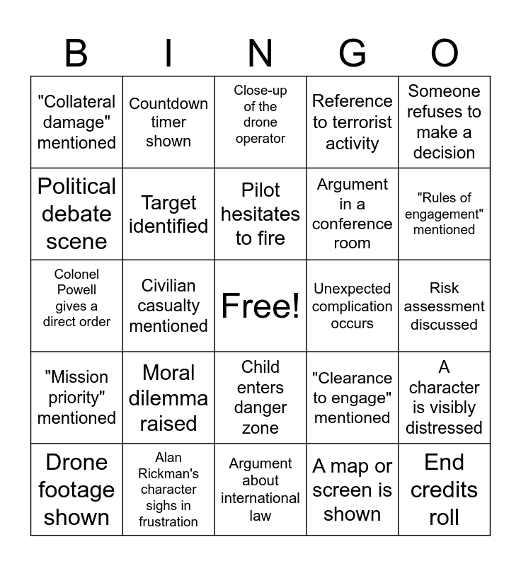 This bingo card has a free space and 24 words: Drone footage shown, Moral dilemma raised, Pilot hesitates to fire, A map or screen is shown, Someone refuses to make a decision, "Collateral damage" mentioned, Countdown timer shown, Close-up of the drone operator, Unexpected complication occurs, Risk assessment discussed, Colonel Powell gives a direct order, Target identified, "Clearance to engage" mentioned, A character is visibly distressed, Political debate scene, Alan Rickman's character sighs in frustration, Argument about international law, Reference to terrorist activity, "Rules of engagement" mentioned, "Mission priority" mentioned, Civilian casualty mentioned, Child enters danger zone, Argument in a conference room and End credits roll.