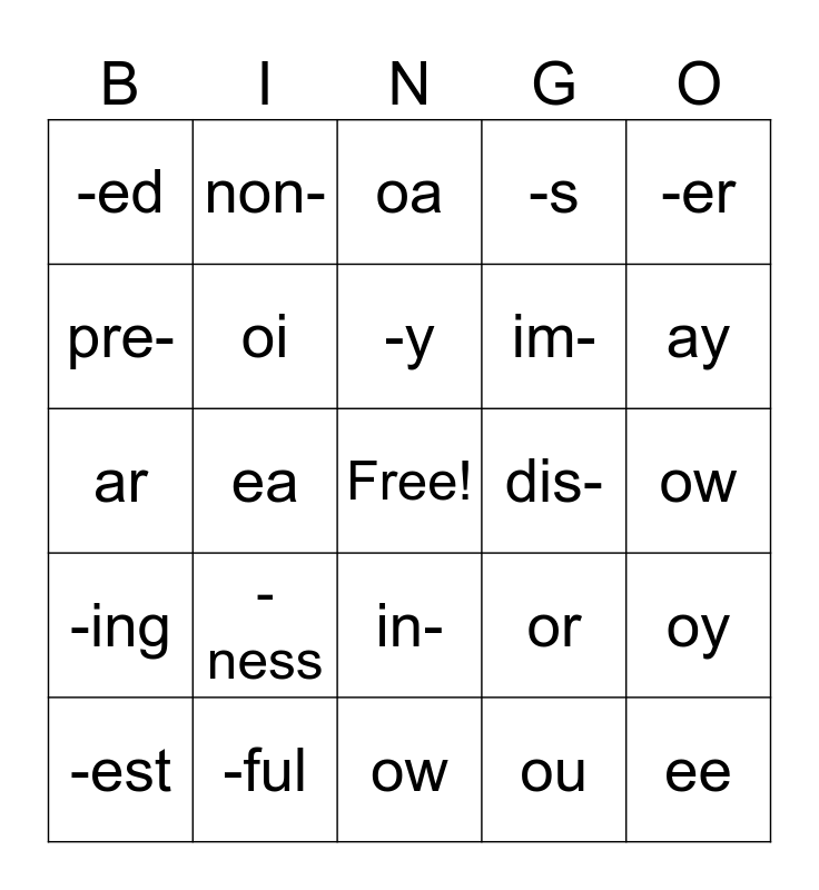 This bingo card has a free space and 24 words: -ness, -ful, -y, -est, -er, -ed, pre-, non-, dis-, in-, im-, ar, or, oy, oi, ou, ow, oa, ay, ea, ee, -ing, -s and ow.