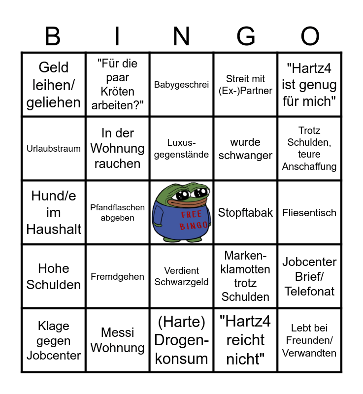 This bingo card has a free space and 41 words: Bewerbungs-gespräch abgesagt/ vergessen, Hund/e im Haushalt, Alkohol/ Zigaretten werden gekauft, In der Wohnung rauchen, Messi Wohnung, Verdient Schwarzgeld, Luxus-gegenstände, "System ist schuld", "Hartz4 ist genug für mich", Hohe Schulden, Pfandflaschen abgeben, Streit mit (Ex-)Partner, Lebt bei Freunden/ Verwandten, Fliesentisch, Stopftabak, Fremdgehen, Suchtproblem, Geld leihen/ geliehen, Vorbestraft, Babygeschrei, Jobcenter Brief/ Telefonat, Post vom Gericht, (Harte) Drogen-konsum, wurde schwanger, "Ich such doch Arbeit, aber...", "Ich brauch erstmal eine Auszeit", "Hartz4 reicht nicht", "Hab zu wenig Geld", aber raucht dabei, Trotz Schulden, teure Anschaffung, "Bewerbung macht keinen Sinn", Kinder "Gr. Glück", Wohnung Hölle, "Für die paar Kröten arbeiten?", Klage gegen Jobcenter, Gaming Setup/ Konsole im Wohnzimmer, Marken-klamotten trotz Schulden, Urlaubstraum, Nachbarsstreit, Überraschender Geldsegen, Möchte Influencer werden, "unmotivierter Mitbewohner ist Schuld" and Kamera zeigt kaputten Gegenstand (wird nie repariert).