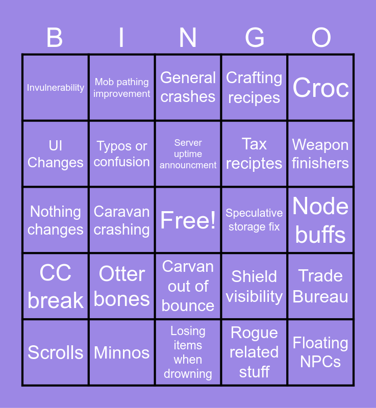This bingo card has a free space and 24 words: Otter bones, Minnos, Server uptime announcment, Scrolls, Croc, Invulnerability, UI Changes, Mob pathing improvement, Speculative storage fix, Carvan out of bounce, Tax reciptes, Nothing changes, Shield visibility, Trade Bureau, Typos or confusion, Rogue related stuff, Node buffs, General crashes, Weapon finishers, Caravan crashing, Floating NPCs, CC break, Crafting recipes and Losing items when drowning.