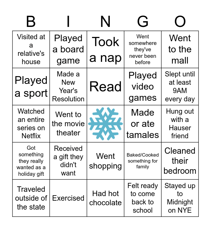 This bingo card has a free space and 29 words: Traveled outside of the state, Went ice skating, Went to the movie theater, Received a gift card, Visited at a relative's house, Took a nap, Made a New Year's Resolution, Received a gift they didn't want, Made or ate tamales, Exercised, Hung out with a Hauser friend, Stayed up to Midnight on NYE, Had hot chocolate, Felt ready to come back to school, Slept until at least 9AM every day, Did something helpful for someone else, Went shopping, Got something they really wanted as a holiday gift, Went to the mall, Watched an entire series on Netflix, Baked/Cooked something for family, Tried a new food, Played video games, Played a sport, Went somewhere they've never been before, Played a board game, Cleaned their bedroom, Read and Made a craft.