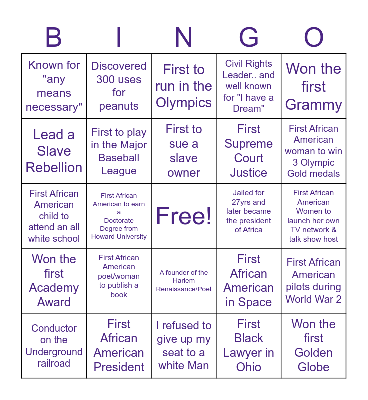 This bingo card has a free space and 24 words: Conductor on the Underground railroad, First African American poet/woman to publish a book, First to sue a slave owner, First Black Lawyer in Ohio, Won the first Grammy, Known for "any means necessary", Discovered 300 uses for peanuts, First to run in the Olympics, Jailed for 27yrs and later became the president of Africa, First African American Women to launch her own TV network & talk show host, First African American child to attend an all white school, First to play in the Major Baseball League, First African American in Space, First African American pilots during World War 2, Lead a Slave Rebellion, First African American President, I refused to give up my seat to a white Man, Civil Rights Leader.. and well known for "I have a Dream", First African American woman to win 3 Olympic Gold medals, Won the first Academy Award, First African American to earn a Doctorate Degree from Howard University, A founder of the Harlem Renaissance/Poet, First Supreme Court Justice and Won the first Golden Globe.