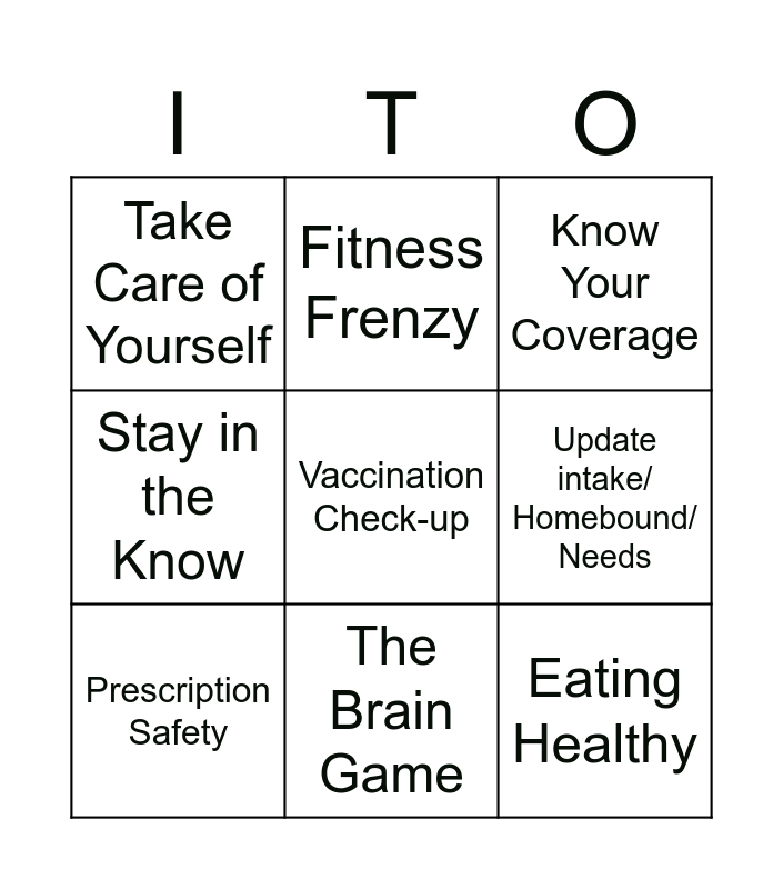 This bingo card has a free space and 8 words: Update intake/ Homebound/ Needs, Know Your Coverage, Fitness Frenzy, Prescription Safety, Take Care of Yourself, Eating Healthy, Stay in the Know and The Brain Game.