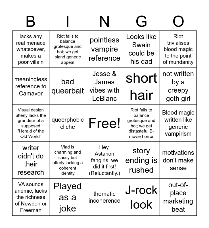 This bingo card has a free space and 24 words: Vlad is charming and sassy but utterly lacking a coherent identity, Played as a joke, Jesse & James vibes with LeBlanc, VA sounds anemic; lacks the richness of Newbon or Freeman, Riot trivialises blood magic to the point of mundanity, lacks any real menace whatsoever, makes a poor villain, meaningless reference to Camavor, Riot fails to balance grotesque and hot; we get bland generic appeal, Riot fails to balance grotesque and hot; we get distasteful B-movie horror, Hey, Astarion fangirls, we did it first! (Reluctantly.), short hair, Visual design utterly lacks the grandeur of a supposed "Herald of the Old World", story ending is rushed, motivations don't make sense, bad queerbait, J-rock look, Blood magic written like generic vampirism, pointless vampire reference, not written by a creepy goth girl, queerphobic cliche, out-of-place marketing beat, writer didn't do their research, Looks like Swain could be his dad and thematic incoherence.