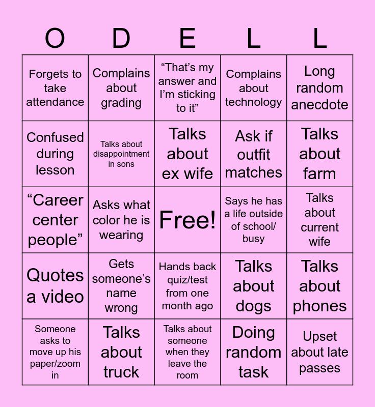 This bingo card has a free space and 24 words: Gets someone’s name wrong, Talks about truck, Talks about ex wife, Someone asks to move up his paper/zoom in, Long random anecdote, Forgets to take attendance, Confused during lesson, Complains about grading, Says he has a life outside of school/ busy, Hands back quiz/test from one month ago, Ask if outfit matches, “Career center people”, Talks about dogs, Talks about phones, Talks about disappointment in sons, Doing random task, Talks about current wife, “That’s my answer and I’m sticking to it”, Talks about farm, Asks what color he is wearing, Upset about late passes, Quotes a video, Complains about technology and Talks about someone when they leave the room.