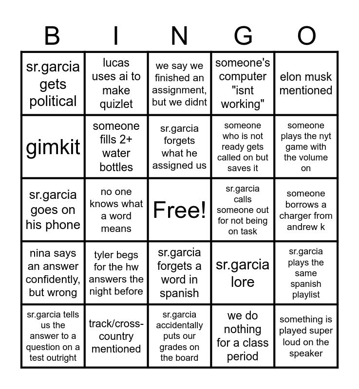 This bingo card has a free space and 26 words: sr.garcia forgets a word in spanish, we do nothing for a class period, sr.garcia forgets what he assigned us, track/cross-country mentioned, elon musk mentioned, sr.garcia gets political, gimkit, lucas uses ai to make quizlet, someone borrows a charger from andrew k, sr.garcia lore, someone who is not ready gets called on but saves it, sr.garcia goes on his phone, sr.garcia plays the same spanish playlist, sr.garcia tells us the answer to a question on a test outright, no one knows what a word means, sr.garcia calls someone an unusual nickname, someone's computer "isnt working", nina says an answer confidently, but wrong, we say we finished an assignment, but we didnt, something is played super loud on the speaker, someone plays the nyt game with the volume on, sr.garcia accidentally puts our grades on the board, sr.garcia calls someone out for not being on task, tyler begs for the hw answers the night before, someone fills 2+ water bottles and no one knows what page we're on.