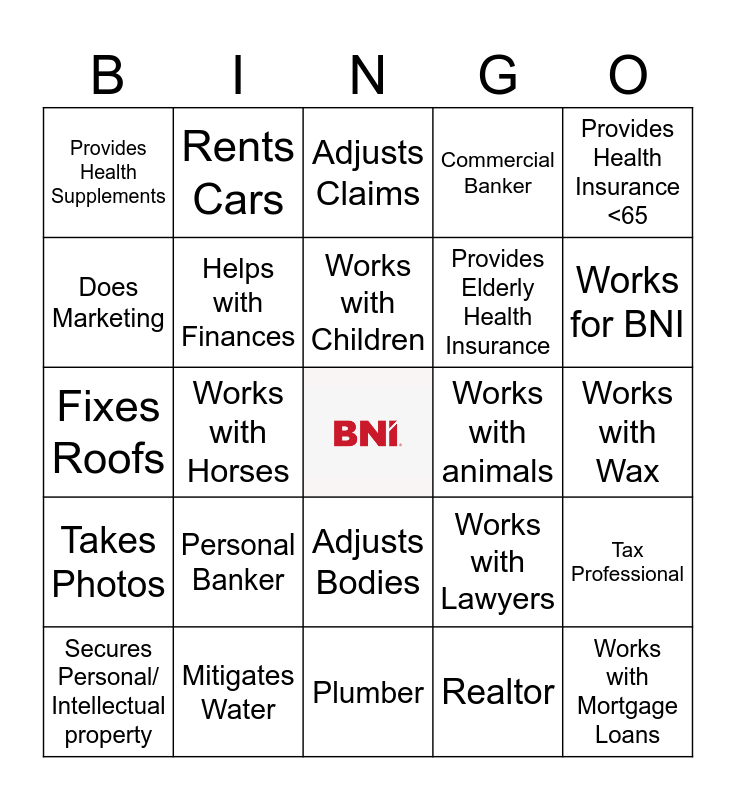 This bingo card has a free space and 24 words: Personal Banker, Mitigates Water, Works with Children, Secures Personal/ Intellectual property, Provides Health Insurance <65, Provides Health Supplements, Does Marketing, Rents Cars, Works with animals, Adjusts Bodies, Provides Elderly Health Insurance, Fixes Roofs, Works with Lawyers, Tax Professional, Helps with Finances, Realtor, Works with Wax, Adjusts Claims, Works for BNI, Works with Horses, Works with Mortgage Loans, Takes Photos, Commercial Banker and Plumber.