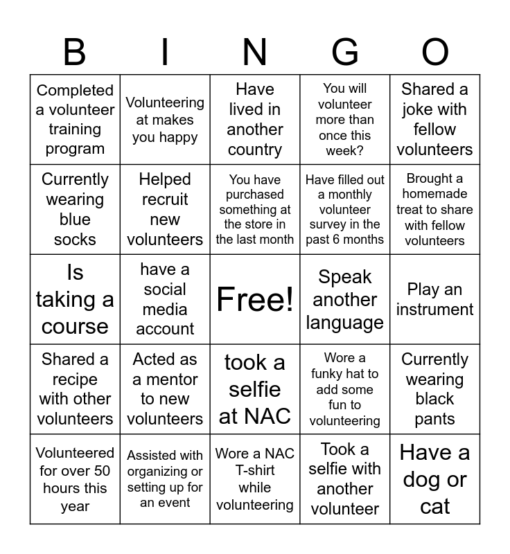 This bingo card has a free space and 29 words: Volunteered for over 50 hours this year, love getting ticket offers, have a social media account, Volunteer with other organizations, Completed a volunteer training program, Have lived in another country, Helped recruit new volunteers, Acted as a mentor to new volunteers, Speak another language, Assisted with organizing or setting up for an event, Play an instrument, Have a dog or cat, Wore a NAC T-shirt while volunteering, Took a selfie with another volunteer, Brought a homemade treat to share with fellow volunteers, Currently wearing a green shirt, took a selfie at NAC, Shared a recipe with other volunteers, Shared a joke with fellow volunteers, Is taking a course, Wore a funky hat to add some fun to volunteering, is retired, Have filled out a monthly volunteer survey in the past 6 months, Currently wearing blue socks, You will volunteer more than once this week?, Volunteering at makes you happy, Currently wearing black pants, You have purchased something at the store in the last month and You have donated to the store in the last 3 months.